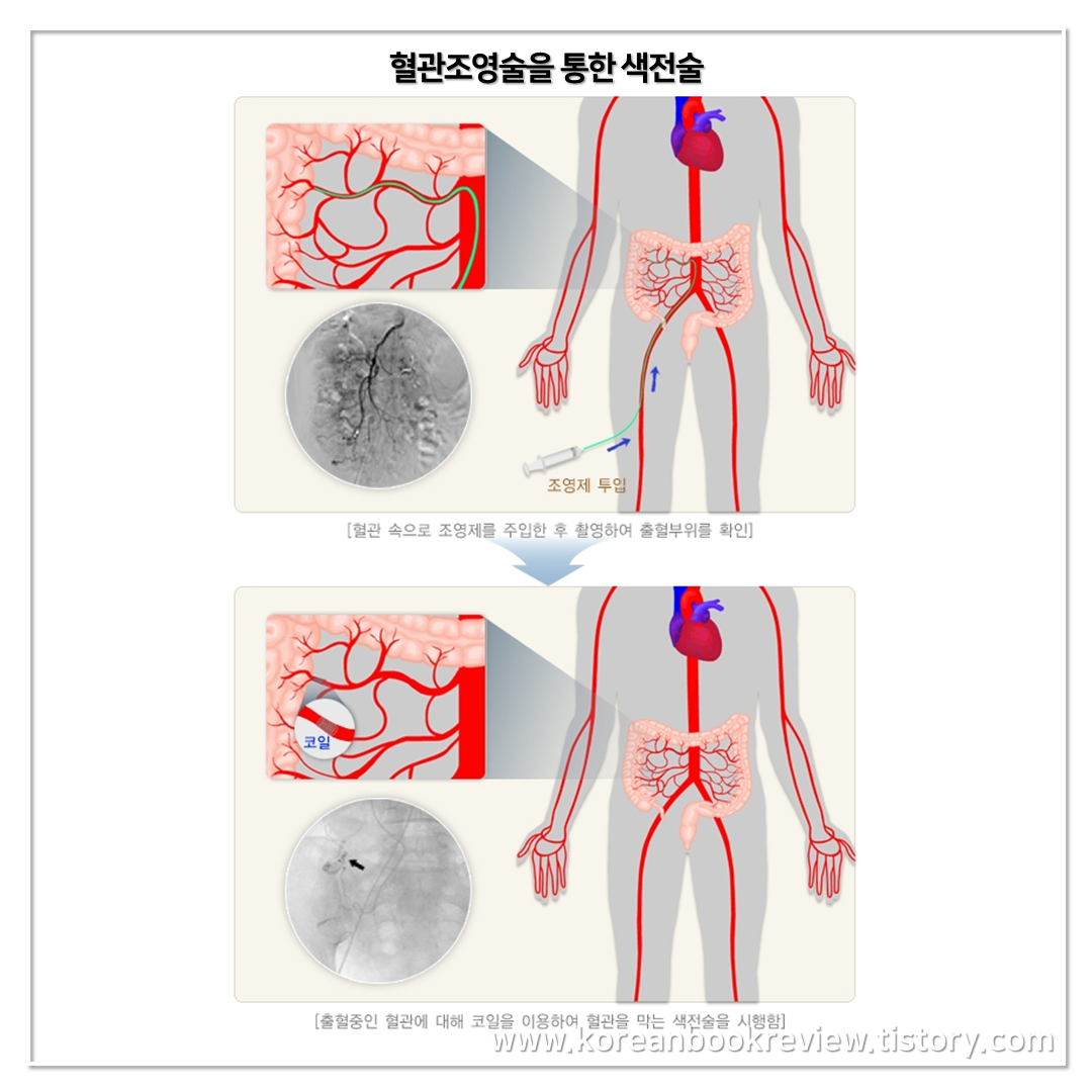 혈관 안으로 가느다란 관을 삽입한 뒤, 관을 통해 조영제를 주사해서 혈관의 모양을 보는 검사입니다. 출혈하는 혈관이 있으면 조영제가 혈관 바깥으로 새어나가기에 병변을 체크할 수 있습니다. 혈관조영술은 검사 당시 출혈하고 있어야 혈관 바깥으로 조영제가 새어나가는 것을 볼 수 있기에, 출혈양이 많고 지금 출혈이 계속되고 있는 경우에 검사합니다.