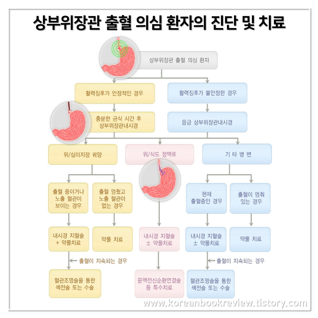 상부위장관 출혈이 의심되는 환자의 진단을 위해 제일 우선 실시하는 검사는 상부위장관내시경입니다. 상부위장관 출혈이 의심되면서 활력징후가 불안정해서 대량 출혈로 추측되면 즉시 응급 내시경을 실시해야 합니다. 활력징후가 안정되서 대량 출혈은 아닌 것으로 판단되면 충분한 금식 뒤, 빠른 시일내에 내시경을 실시합니다.